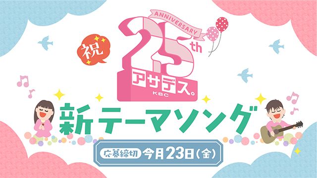 必要事項をご確認の上、下部にある「送信する」ボタンを押してください。 視聴者の“想い”をテーマ曲に!あなたにとって「アサデス。KBC」とは?視聴者の“想い”をテーマ曲に!どんな気持ちで毎朝、一日をスタートさせたいですか? この度は「アサデス。KBC」のアンケートにご協力頂き、ありがとうございます。 「アサデス。KBC」は、2026年に放送開始から25周年を迎えます。 これを記念し、新たな番組テーマソングを制作いたします。この曲は毎朝番組のオープニング曲としても使用する予定です。この曲には毎朝アサデスをご覧いただいている視聴者の皆様の想いを盛り込んだものにしたいと考えています。そこで、皆様から、毎朝、どんな気持ちで1日をスタートさせたいかや1日の始まりにどんな言葉をかけてほしいか、番組に対する“想い”などを募集します。頂いた言葉やご意見、想いを歌詞へと昇華させ、1日のはじまりに元気と活力を届ける”応援歌”となる楽曲を一から制作していきます。皆様と一緒に1日の始まりに聞く曲をつくり上げていきましょう!ご協力どうぞよろしくお願い致します。 必須年齢0歳1歳2歳3歳4歳5歳6歳7歳8歳9歳10歳11歳12歳13歳14歳15歳16歳17歳18歳19歳20歳21歳22歳23歳24歳25歳26歳27歳28歳29歳30歳31歳32歳33歳34歳35歳36歳37歳38歳39歳40歳41歳42歳43歳44歳45歳46歳47歳48歳49歳50歳51歳52歳53歳54歳55歳56歳57歳58歳59歳60歳61歳62歳63歳64歳65歳66歳67歳68歳69歳70歳71歳72歳73歳74歳75歳76歳77歳78歳79歳80歳81歳82歳83歳84歳85歳86歳87歳88歳89歳90歳91歳92歳93歳94歳95歳96歳97歳98歳99歳100歳101歳102歳103歳104歳105歳106歳107歳108歳109歳110歳111歳112歳113歳114歳115歳116歳117歳118歳119歳120歳121歳122歳123歳124歳125歳必須性別 男性女性その他必須お住いの市町村を教えてください。必須職業を教えてください。会社員自営業主婦主夫大学生専門学生高校生中学生小学生その他必須あなたにとって「アサデス。KBC」はどのような存在ですか? 【「文字だけでは伝えきれない」という方は、ご自身の言葉で話している動画を添付ファイルでお送りください。】必須アサデスを見ている時間はご自身にとってどういう時間ですか?任意「朝はこういう気持ちにして欲しい」など、朝の番組に求めることがあれば教えてください。任意朝の番組を通して「こんな言葉をかけて欲しい」「こんなことがあれば元気になれる」などがあれば教えてください。任意ご回答によって、取材をさせていただく可能性がございます。可能であれば電話番号をご記入ください。任意添付ファイル合計1GBまで個人情報の取扱規定(必須)九州朝日放送株式会社の個人情報の取り扱いについて同意される方のみ送信できます。https://kbc.co.jp/guideline/privacy.php 同意する ※再生後、自動で応募画面に移動します。