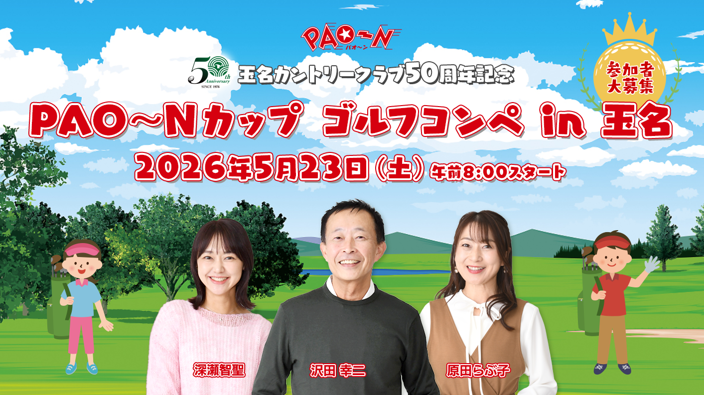 必要事項をご確認の上、下部にある「送信する」ボタンを押してください。 玉名カントリークラブ50 周年記念 PAO~Nカップゴルフコンペ in 玉名PAO N カップは、 2006 年にスタートして、 20 年目を迎えました。 リスナーとパオーンのパーソナリティもプレーと懇親会に参加する楽しいコンペです。 今年は、玉名カントリークラブが開場 50 周年を迎えたこともあり、 お祝いムード倍増、コンペ賞品も倍増でお楽しみ頂きます。 ------------------------------------- 【プレー・設備について】 ・セルフプレー形式:本コンペはセルフプレーです 。 カートはカート道路(電磁誘導線)のみの走行となり、コース内への乗り入れはできません。 ・最新ヤマハ乗用カートおよび、カートナビゲーションシステム(マーシャル-Ai)を完備しております。 ・リーダーズボード:ナビゲーションの「リーダーズボード機能」により、参加者全員のリアルタイム順位(グロススコア)を確認しながらプレーをお楽しみいただけます。 ・参加費 20,000円(税込)には、 プレー費(カート代込)、昼食、パーティ費、ゴルフ場利用税、消費税(10%)が含まれます 。 【組み合わせについて】 ・予約はお一人様からお申込みいただけます 。 ・組み合わせは原則として事務局にて決定し、お客様による変更は承れません。 ・各組のプレー人数が3名以上となるよう調整いたします。欠員やキャンセル等の状況により、当日までに組み合わせが変更になる場合がございますので予めご了承ください。 【キャンセルポリシー・当選連絡】 ・2026年5月1日までに、代表者様へ当選・落選の結果をご連絡いたします 。 ・開催確定後のキャンセルについては、お一人様につき5,000円のキャンセルフィを頂戴いたします。 ・止むを得ない事情で欠席される場合は、速やかに事務局(KBC UNIE)までご連絡ください。 TEL.092-721-0510(代表)平日9:30~17:30 パオーンカップ担当(川辺、今村) コンペの詳細はコチラ必須郵便番号必須ご住所 都道府県 北海道 青森県 岩手県 宮城県 秋田県 山形県 福島県 茨城県 栃木県 群馬県 埼玉県 千葉県 東京都 神奈川県 新潟県 富山県 石川県 福井県 山梨県 長野県 岐阜県 静岡県 愛知県 三重県 滋賀県 京都府 大阪府 兵庫県 奈良県 和歌山県 鳥取県 島根県 岡山県 広島県 山口県 徳島県 香川県 愛媛県 高知県 福岡県 佐賀県 長崎県 熊本県 大分県 宮崎県 鹿児島県 沖縄県 市町村 北九州市 福岡市 大牟田市 久留米市 直方市 飯塚市 田川市 柳川市 八女市 筑後市 大川市 行橋市 豊前市 中間市 小郡市 筑紫野市 春日市 大野城市 宗像市 太宰府市 古賀市 福津市 うきは市 宮若市 嘉麻市 朝倉市 みやま市 糸島市 那珂川市 糟屋郡宇美町 糟屋郡篠栗町 糟屋郡志免町 糟屋郡須惠町 糟屋郡新宮町 糟屋郡久山町 糟屋郡粕屋町 遠賀郡芦屋町 遠賀郡水巻町 遠賀郡岡垣町 遠賀郡遠賀町 鞍手郡小竹町 鞍手郡鞍手町 嘉穂郡桂川町 朝倉郡筑前町 朝倉郡東峰村 三井郡大刀洗町 三潴郡大木町 八女郡広川町 田川郡香春町 田川郡添田町 田川郡糸田町 田川郡川崎町 田川郡大任町 田川郡赤村 田川郡福智町 京都郡苅田町 京都郡みやこ町 築上郡吉富町 築上郡上毛町 築上郡築上町 市町村 佐賀市 唐津市 鳥栖市 多久市 伊万里市 武雄市 鹿島市 小城市 嬉野市 神埼市 神埼郡吉野ヶ里町 三養基郡基山町 三養基郡上峰町 三養基郡みやき町 東松浦郡玄海町 西松浦郡有田町 杵島郡大町町 杵島郡江北町 杵島郡白石町 藤津郡太良町 必須お名前必須フリガナ必須電話番号必須メールアドレス必須年齢0歳1歳2歳3歳4歳5歳6歳7歳8歳9歳10歳11歳12歳13歳14歳15歳16歳17歳18歳19歳20歳21歳22歳23歳24歳25歳26歳27歳28歳29歳30歳31歳32歳33歳34歳35歳36歳37歳38歳39歳40歳41歳42歳43歳44歳45歳46歳47歳48歳49歳50歳51歳52歳53歳54歳55歳56歳57歳58歳59歳60歳61歳62歳63歳64歳65歳66歳67歳68歳69歳70歳71歳72歳73歳74歳75歳76歳77歳78歳79歳80歳81歳82歳83歳84歳85歳86歳87歳88歳89歳90歳91歳92歳93歳94歳95歳96歳97歳98歳99歳100歳101歳102歳103歳104歳105歳106歳107歳108歳109歳110歳111歳112歳113歳114歳115歳116歳117歳118歳119歳120歳121歳122歳123歳124歳125歳必須性別 男性女性その他必須同行者がいる場合、全員分の【氏名・性別・生年月日】を記載ください。1名でご参加の方は【1名で参加】とご記載ください。必須メール許諾プレゼントキャンペーンや新規サービスのお知らせをメールにお送りしても良いですか?許可する許可しない